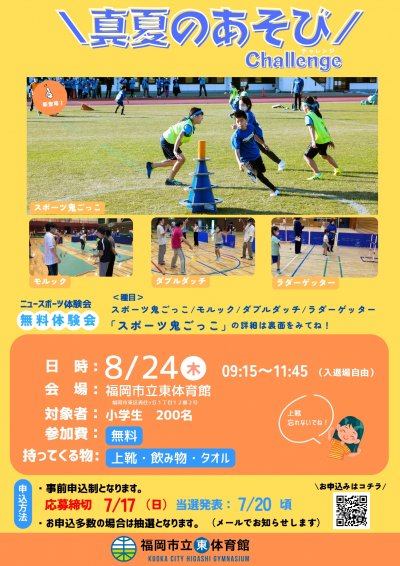 トップページ > 新着&トピックス一覧 > 【参加無料/参加者募集/事前申込要】8月24日(木)福岡市立東体育館「真夏のあそびチャレンジ」開催のお知らせ